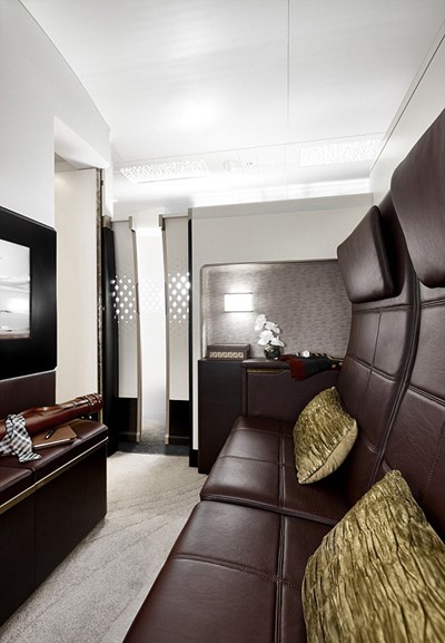وبحسب الصور التي تم نشرها لأفخم طائرة في العالم فإنها تتضمن أجنحة كل منها يضم ثلاث غرف (منزل طائر)، كما أن شركة "الاتحاد" توفر لكل جناح طباخاً خاصاً بركابه و"كبير خدم" ليقوم بتقديم الخدمات اللازمة التي يطلبها المسافرون على هذه الدرجة.